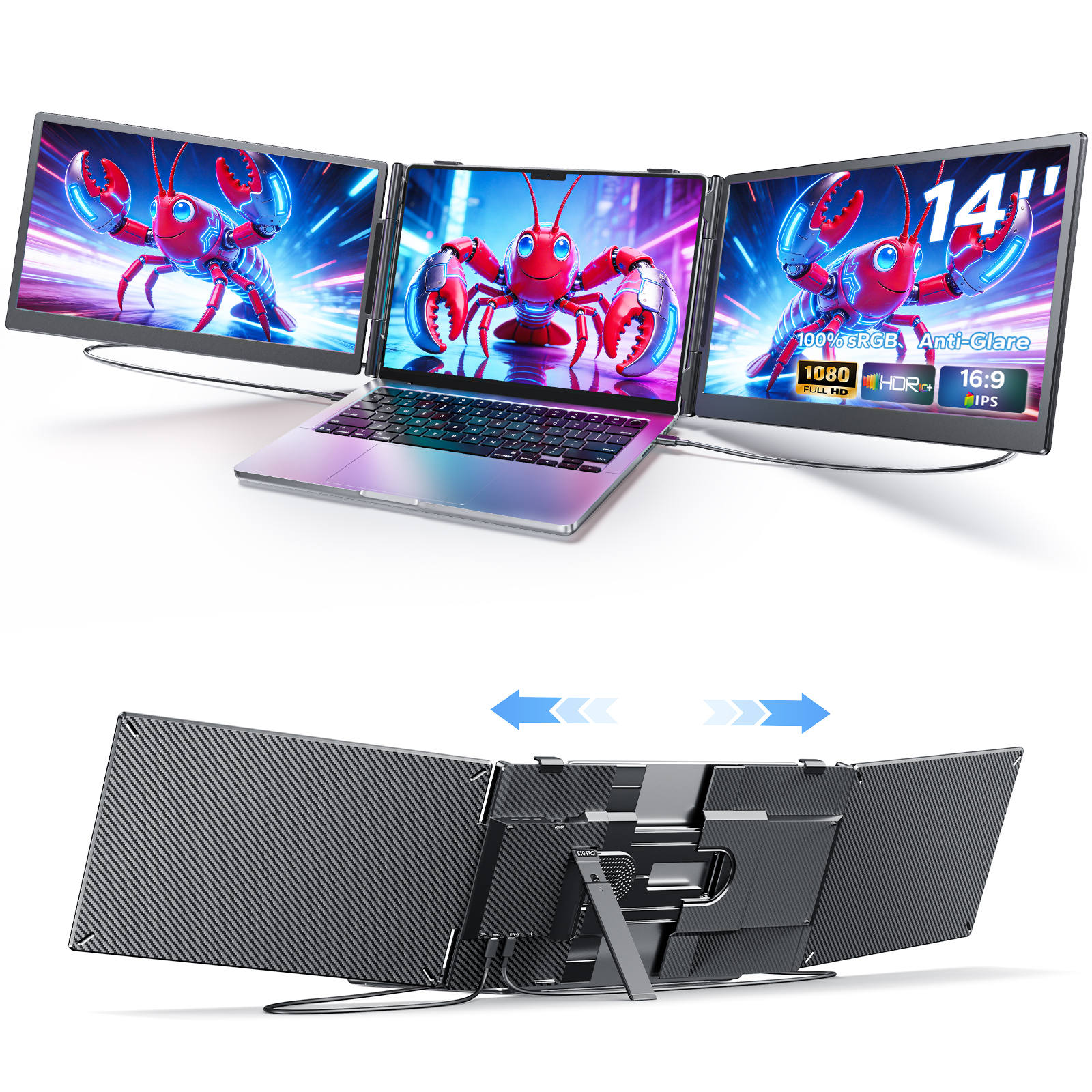 Triple screen setup with 2 extension screens for ultimate productivity. Two 14" FHD 1080P IPS displays with 100% sRGB, perfect for multitasking, coding, gaming, and professional work.