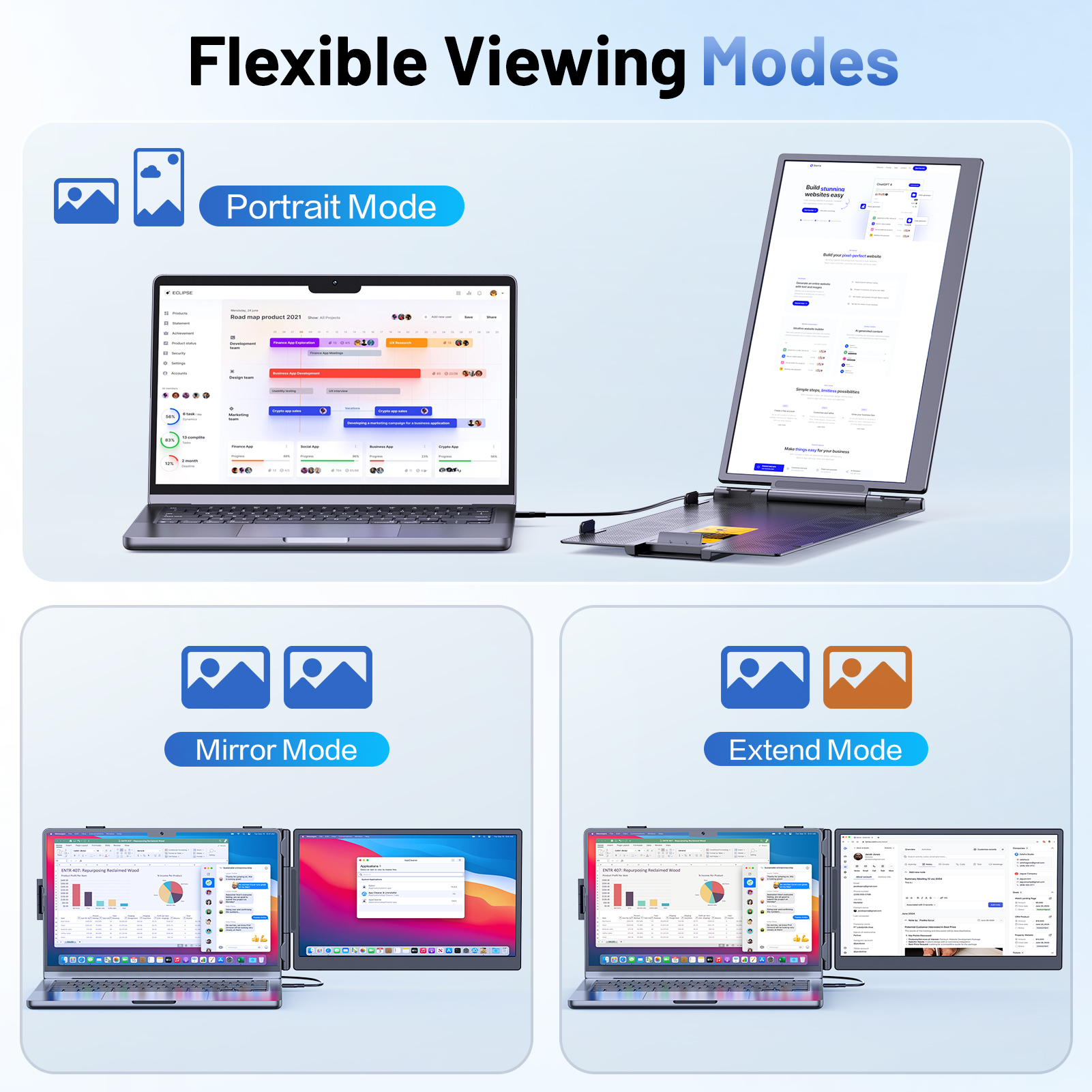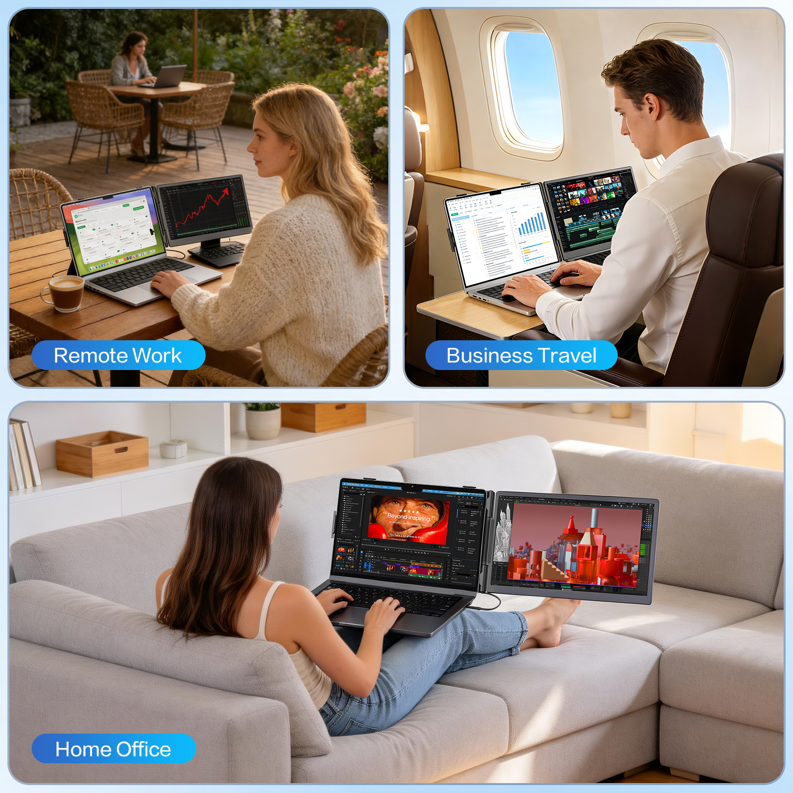 As someone who works from coffee shops and co-working spaces, this portable monitor has been amazing. The dual-screen setup lets me keep my main work on the laptop while having my communication apps, notes, or reference materials on the extender. The 180° rotation is super useful for presentations.