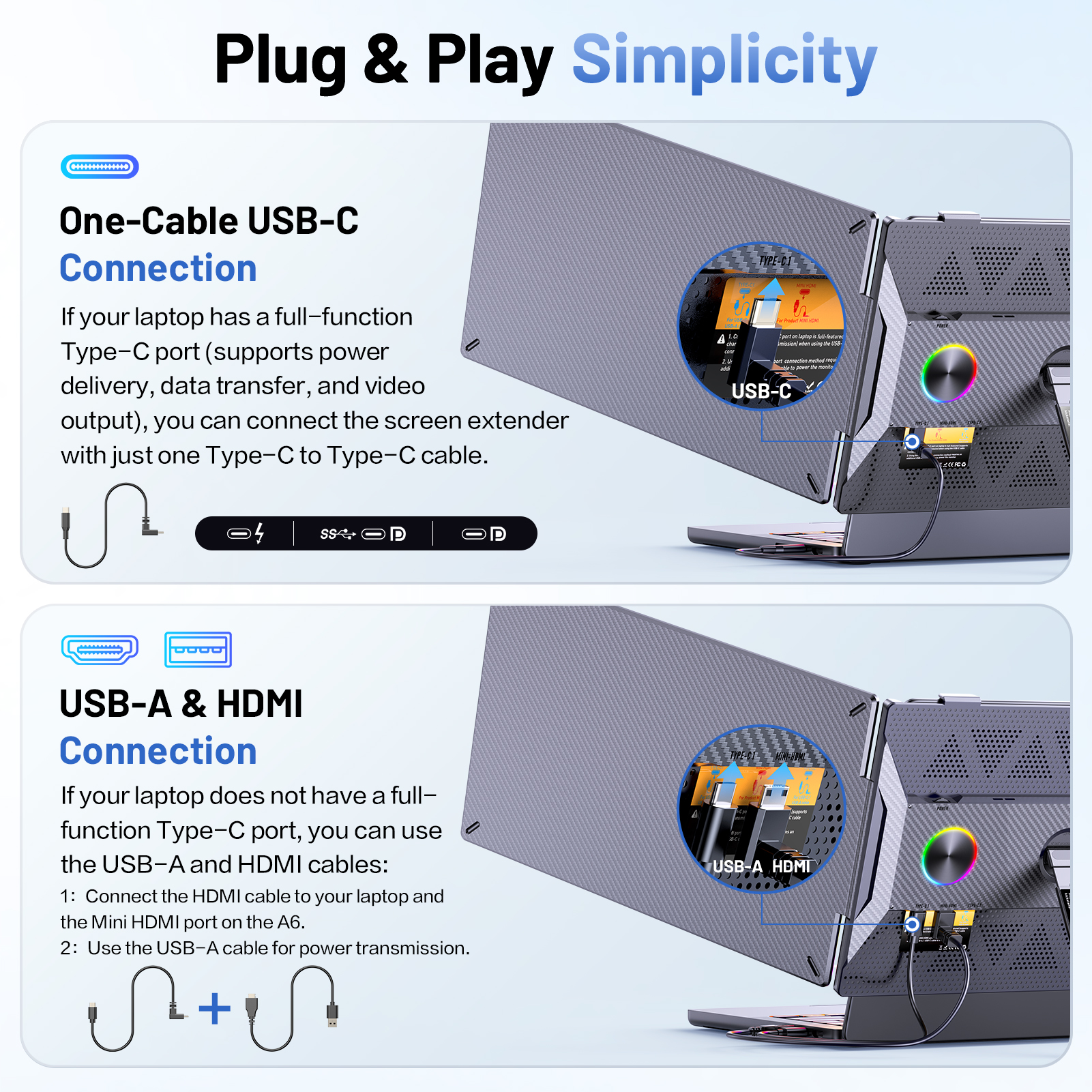 USB-C plug and play, supports 13–17.3 inch laptops. Works seamlessly with macOS and Windows. One-cable power and video transmission simplifies setup.